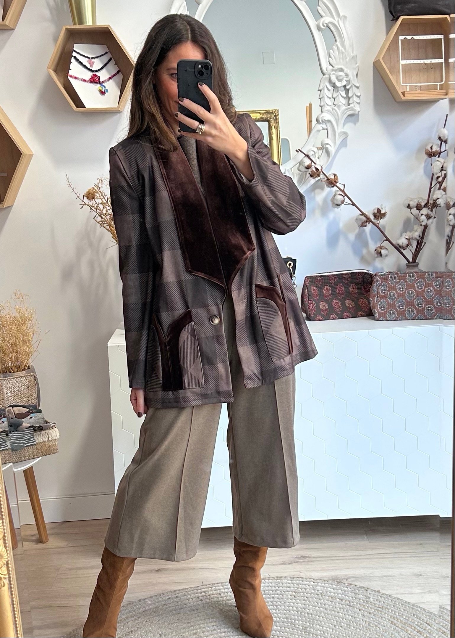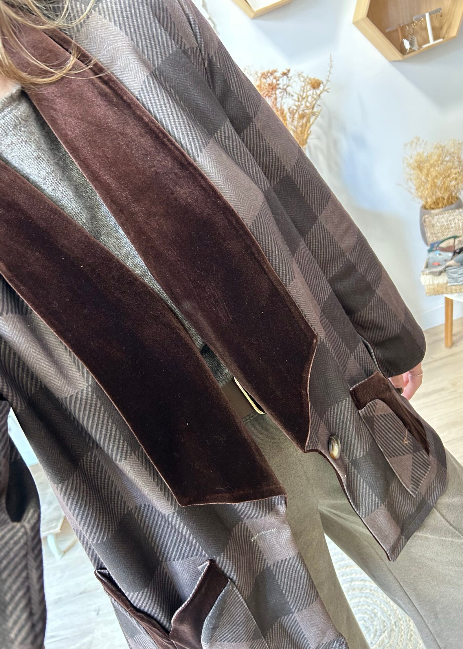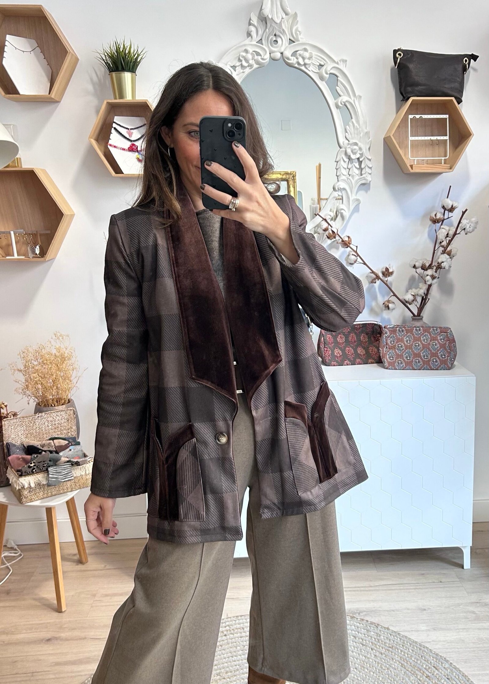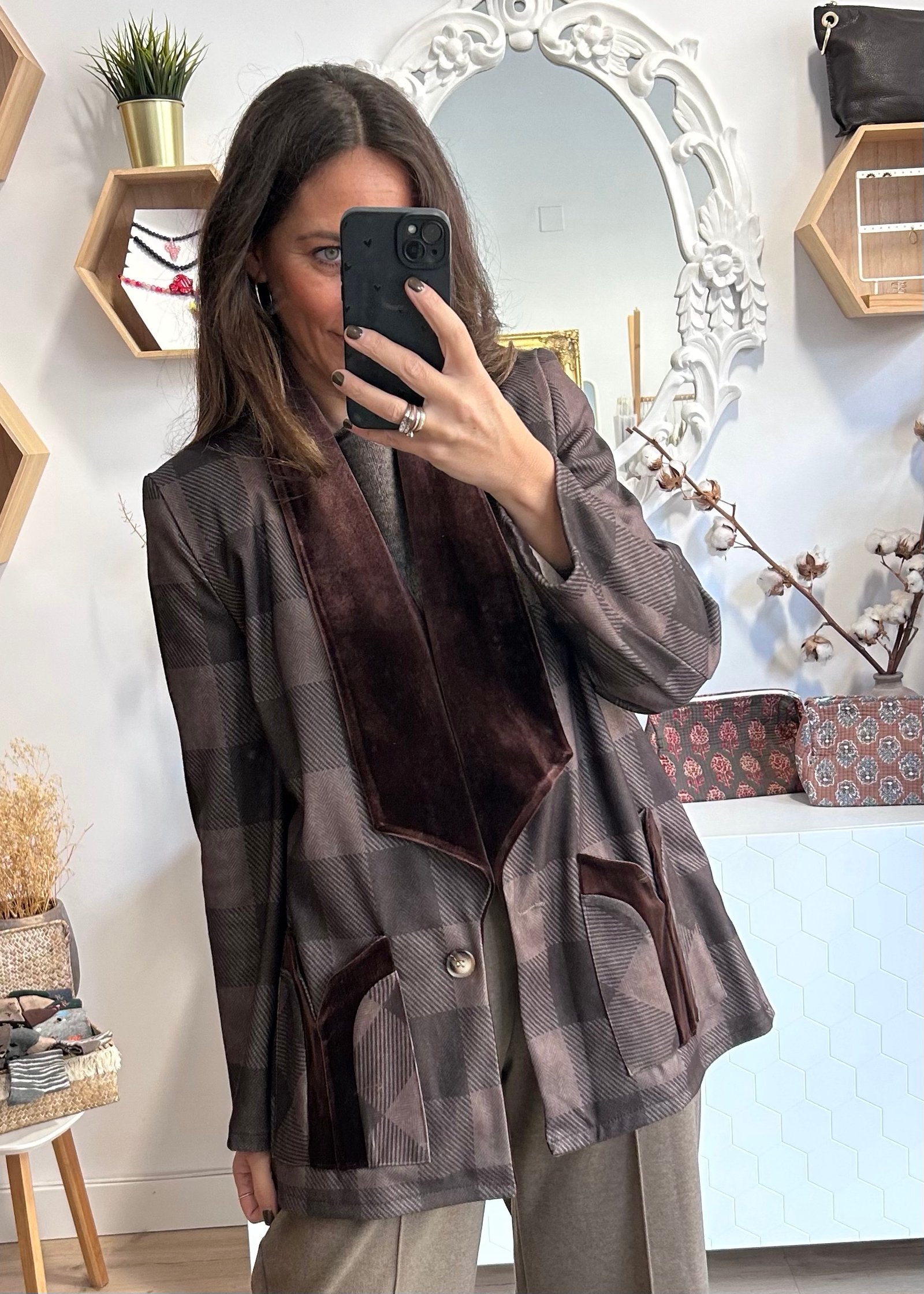 Blazer con estampado de cuadros y solapas en terciopelo marrón chocolate.