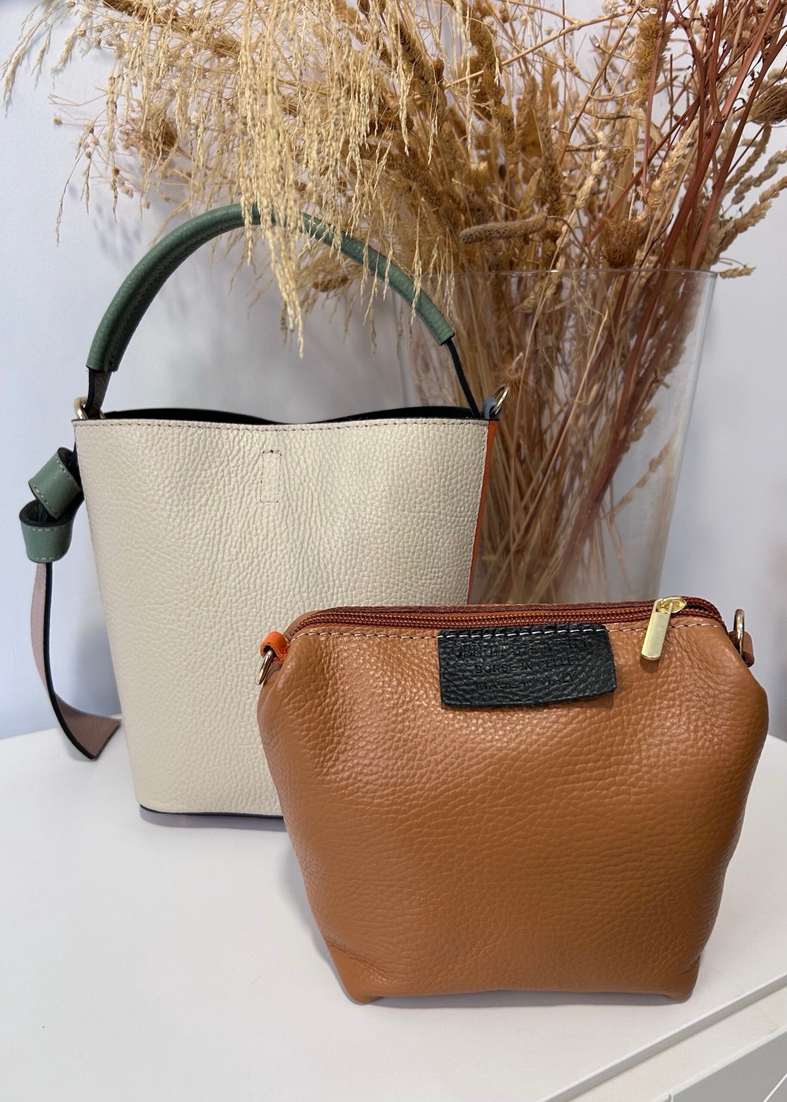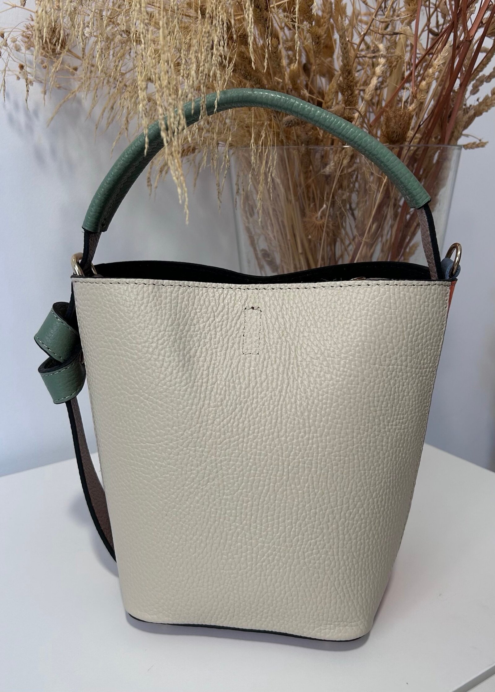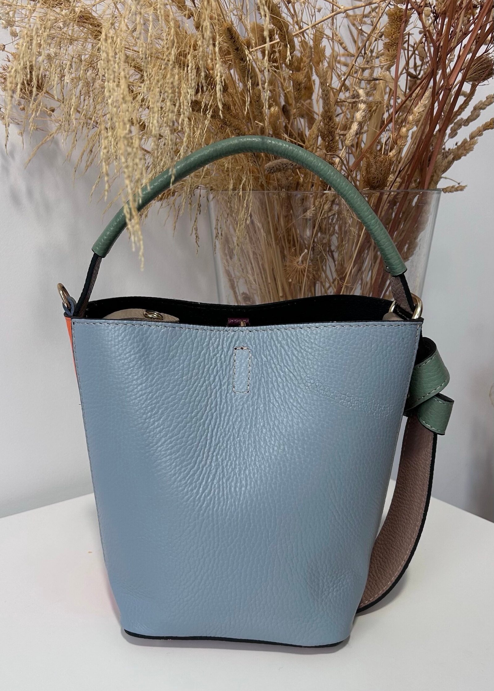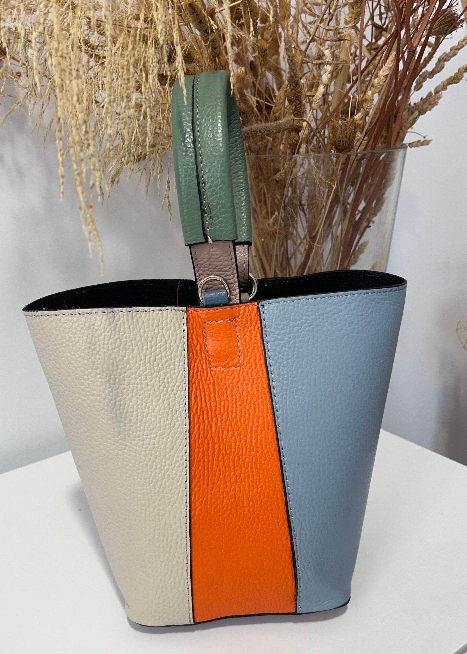 Bolso en piel color beige y azul