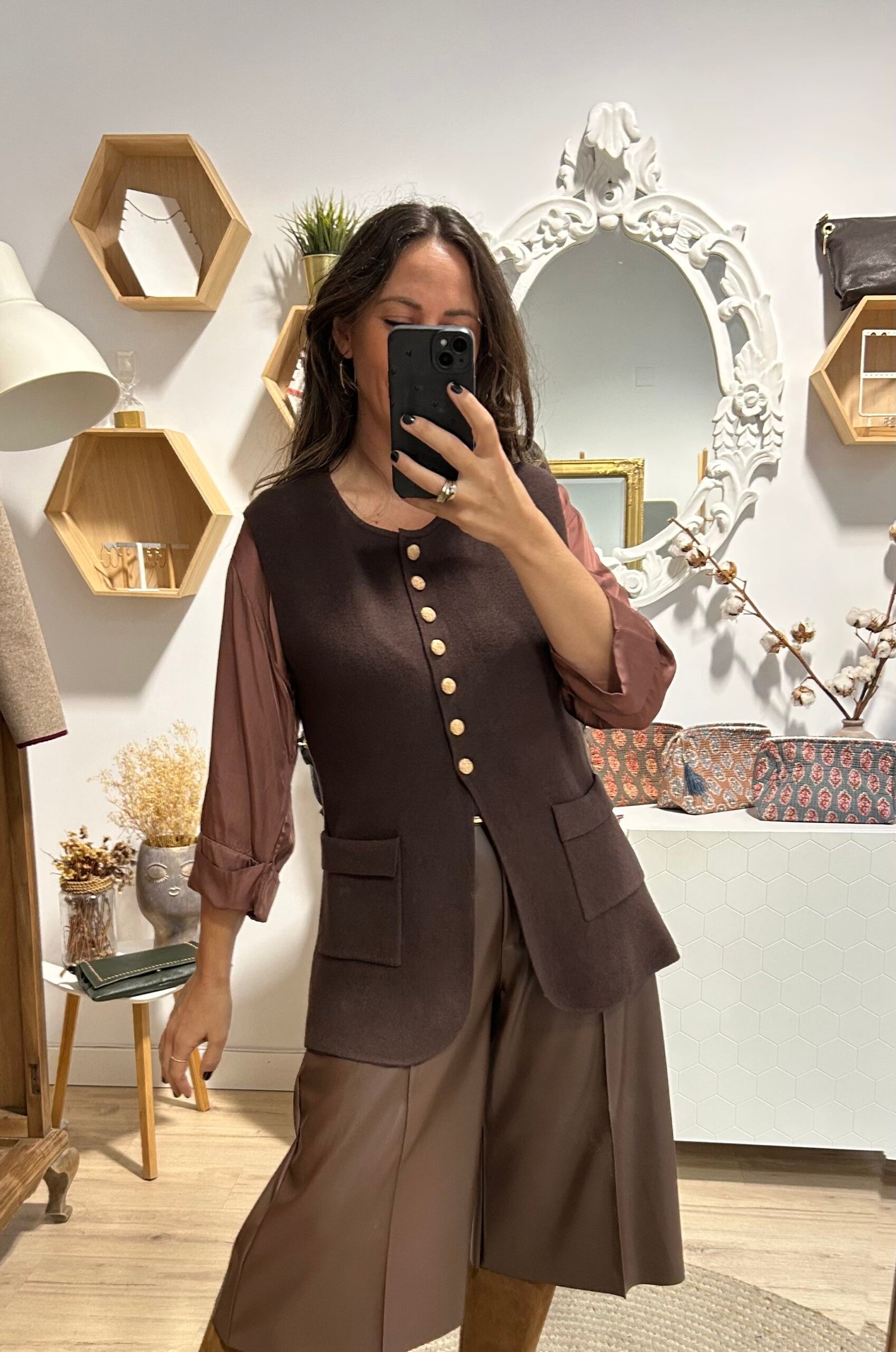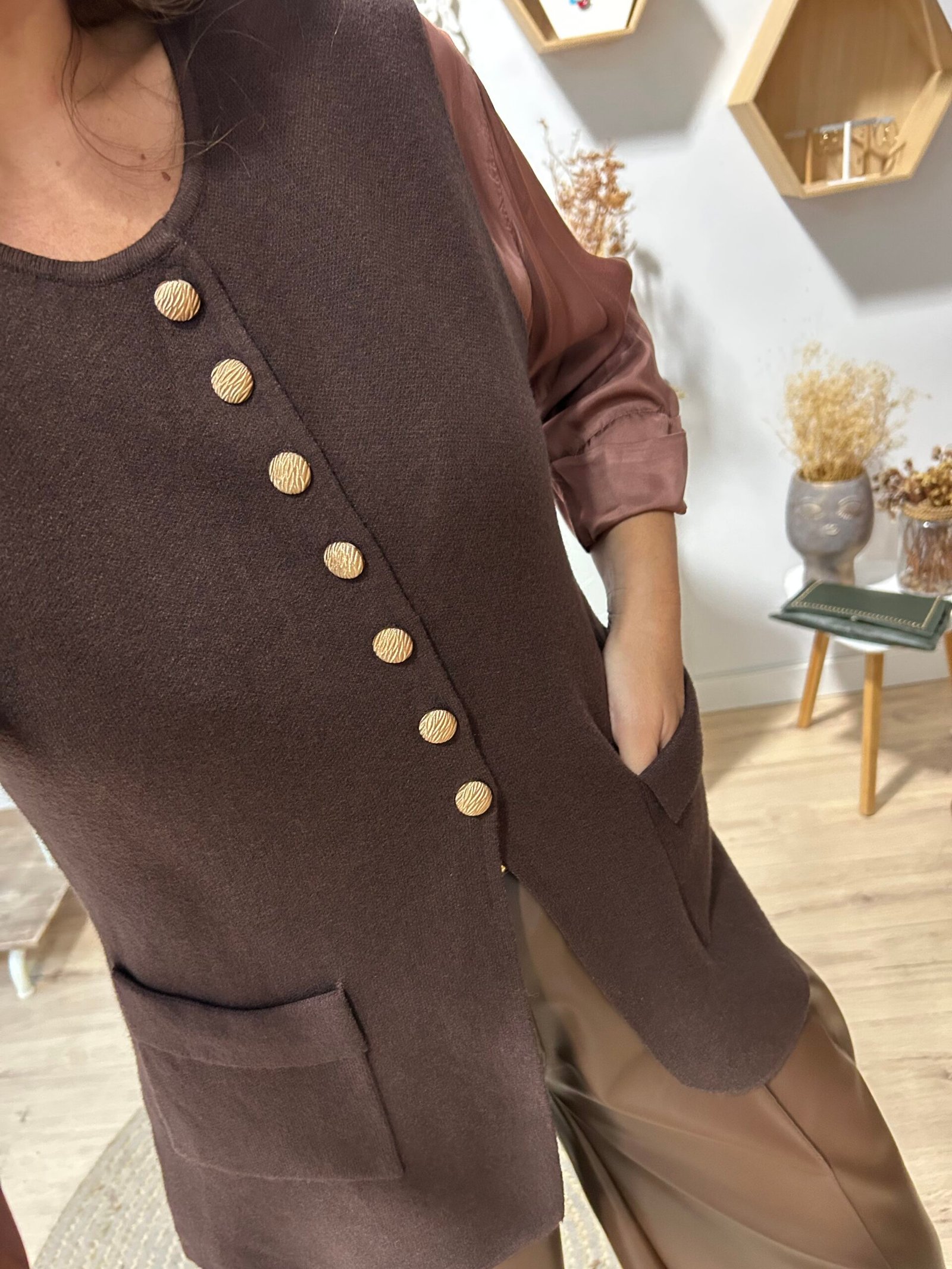 Cierre delantero con botones en dorado, bolsillos delanteros y manga sisa
