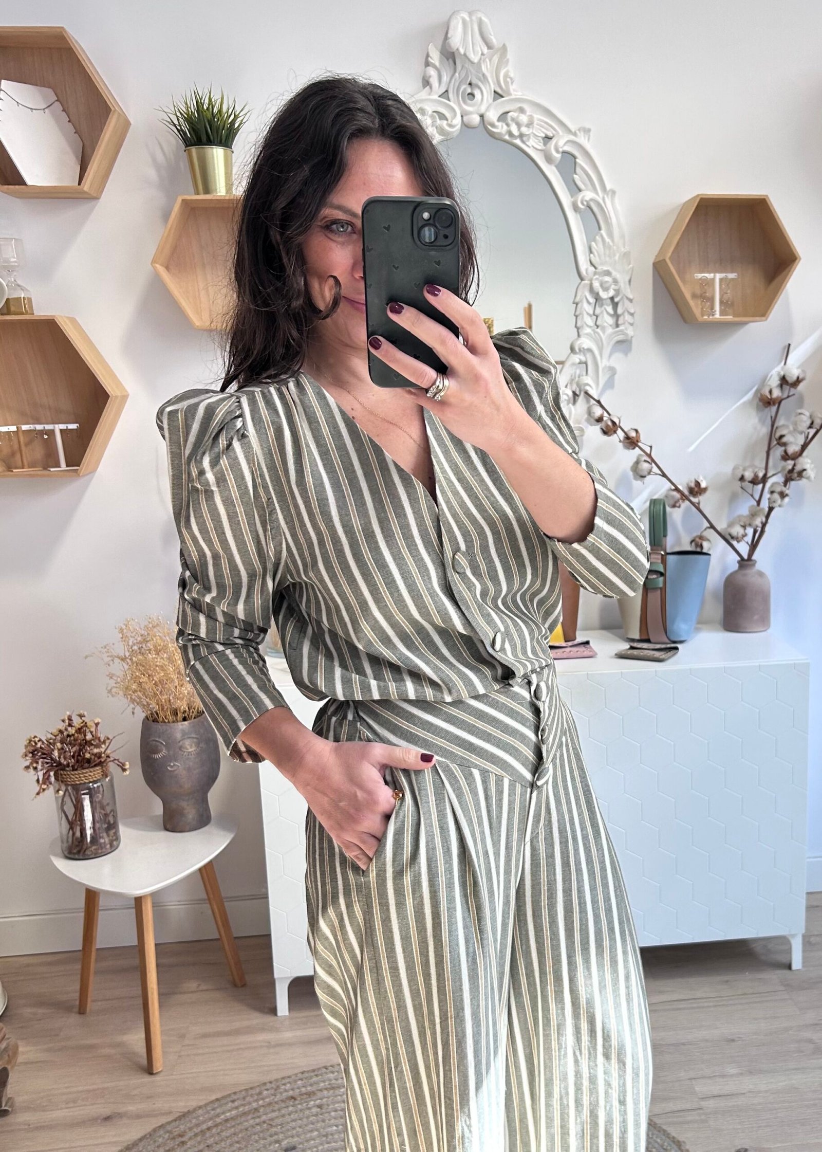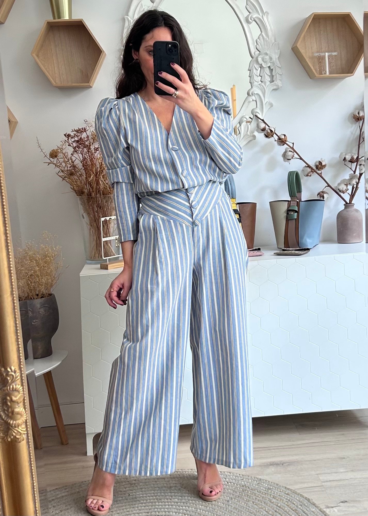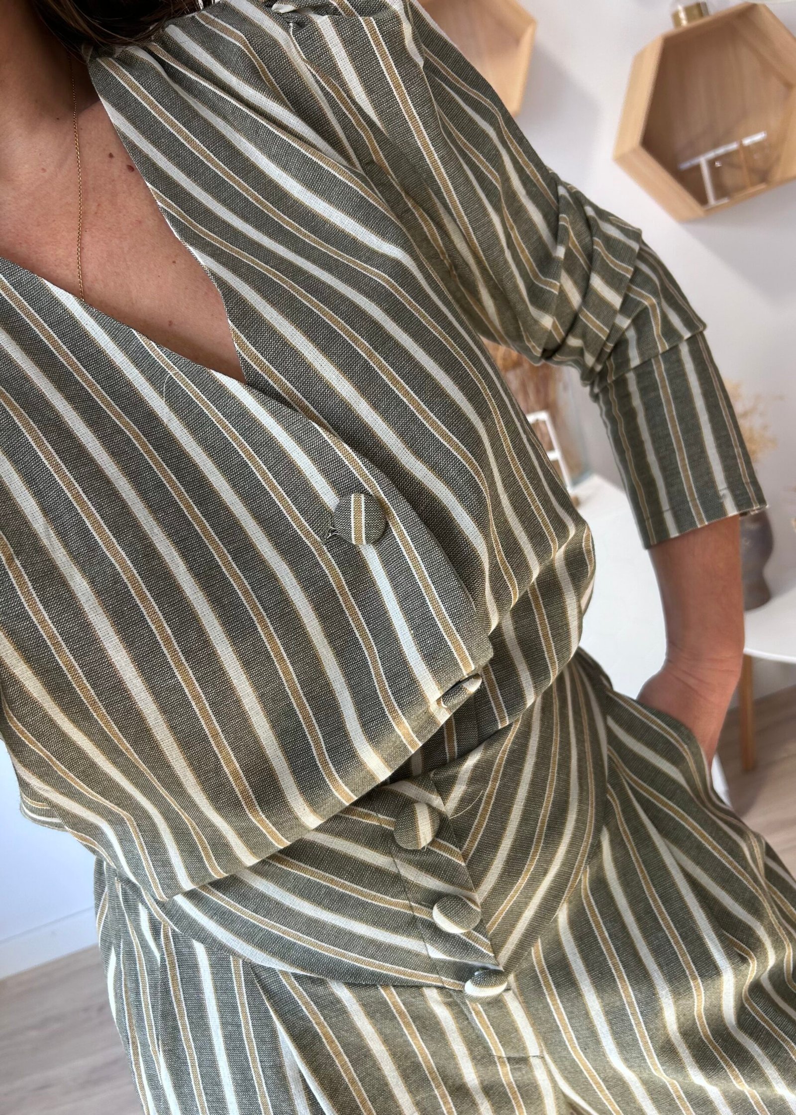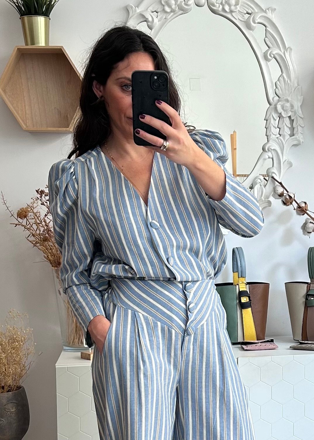 Chaqueta con manga abullonada, estampado de rayas. Cierre delantero con botones forrados de la misma tela. Este modelo de chaqueta tiene un pantalón a juego.
