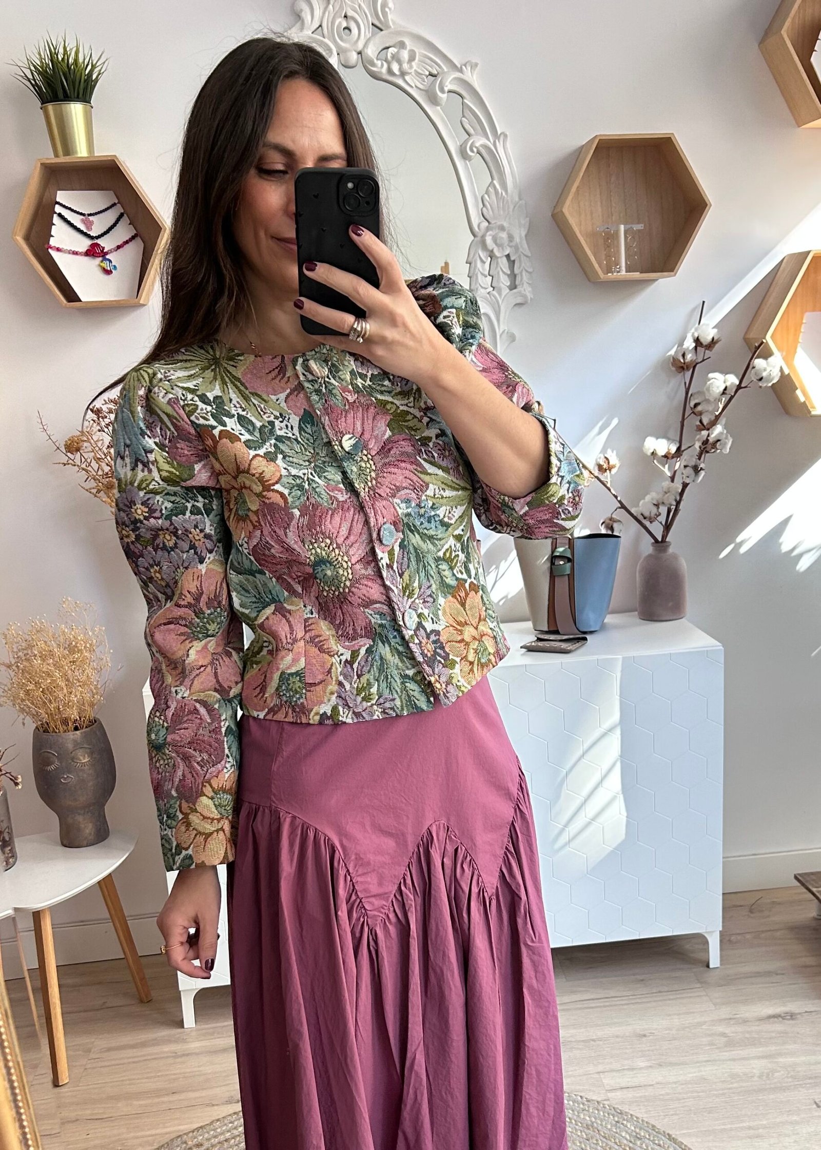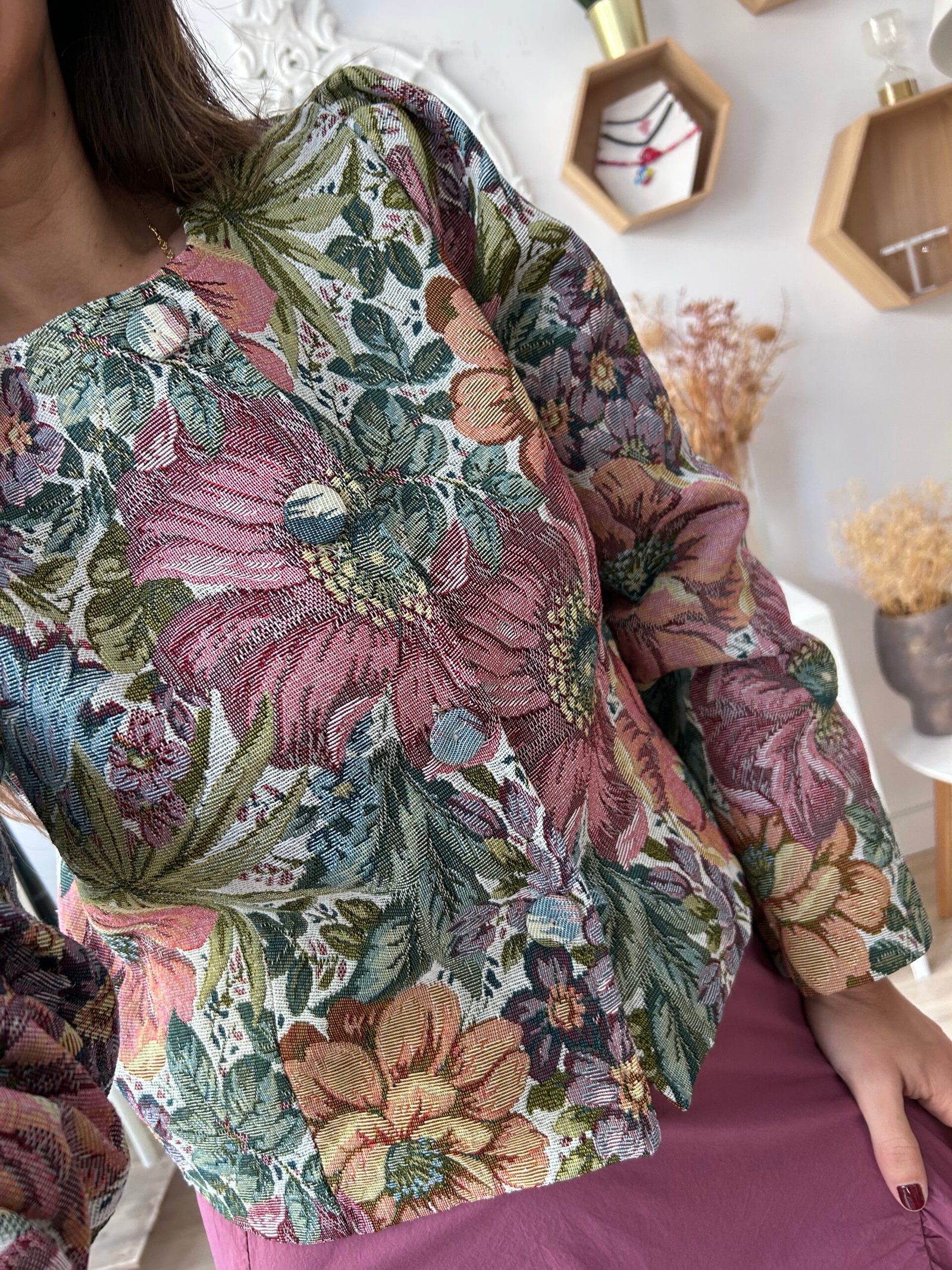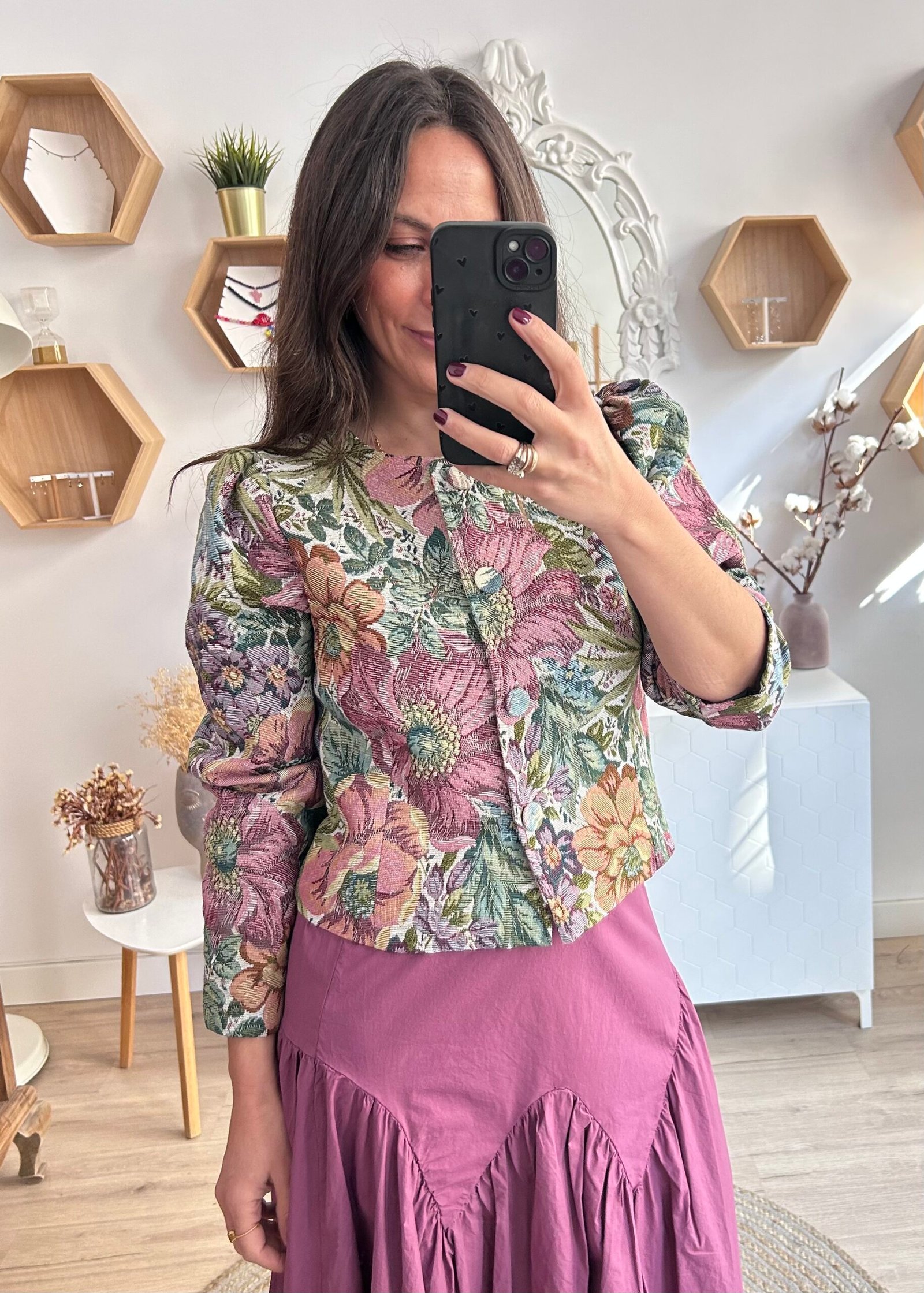 Chaqueta con estampado floral, forro interior, cuello redondo y cierre delantero con botones forrados
