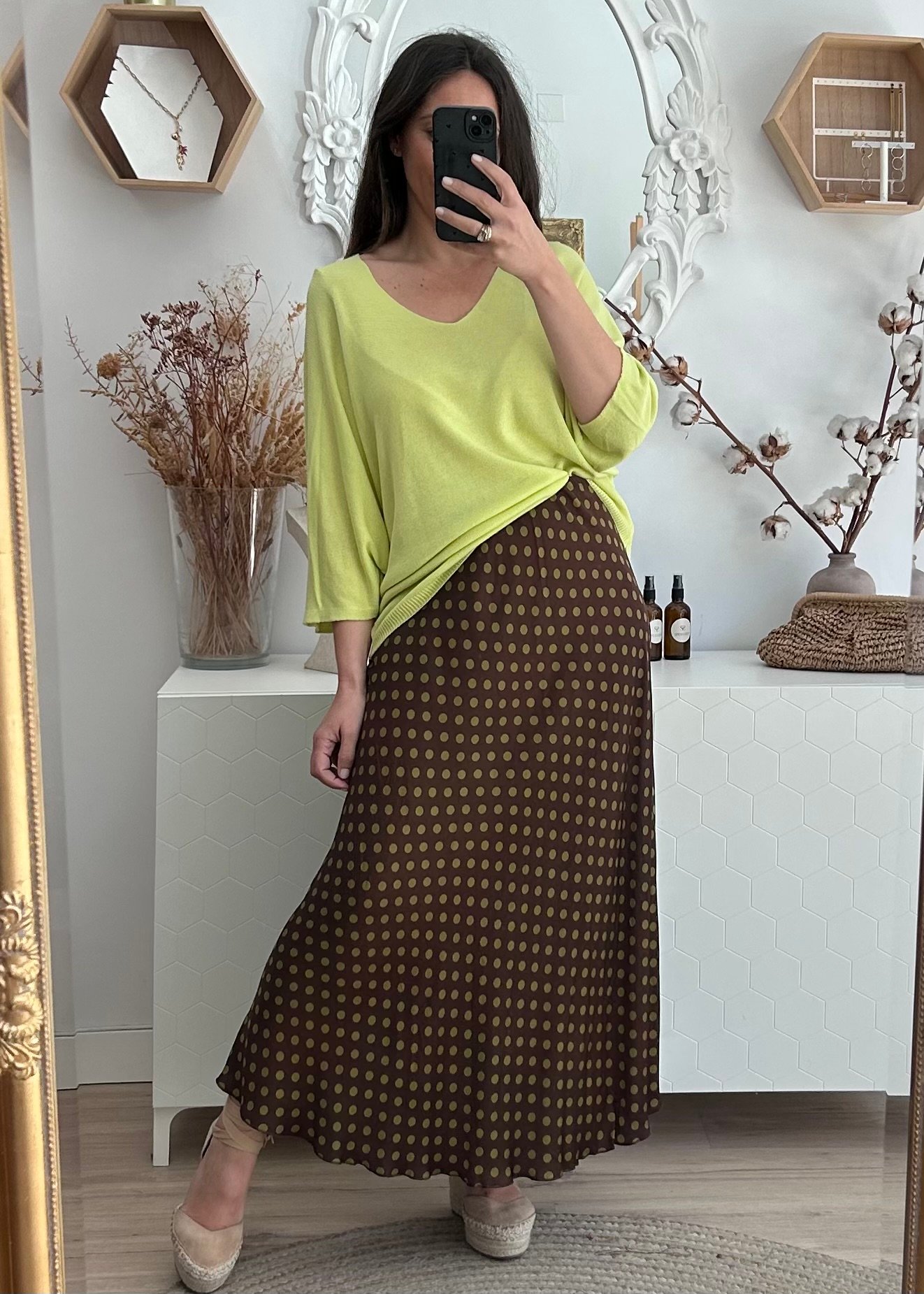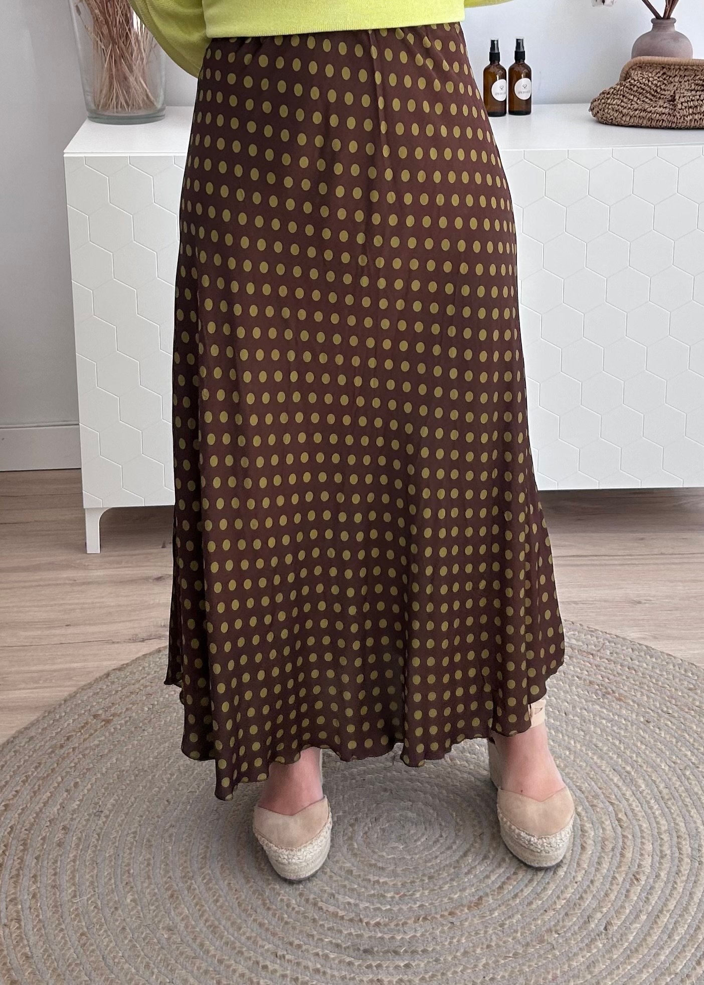 Falda satinada en chocolate con estampado de lunares en color verde pistacho.