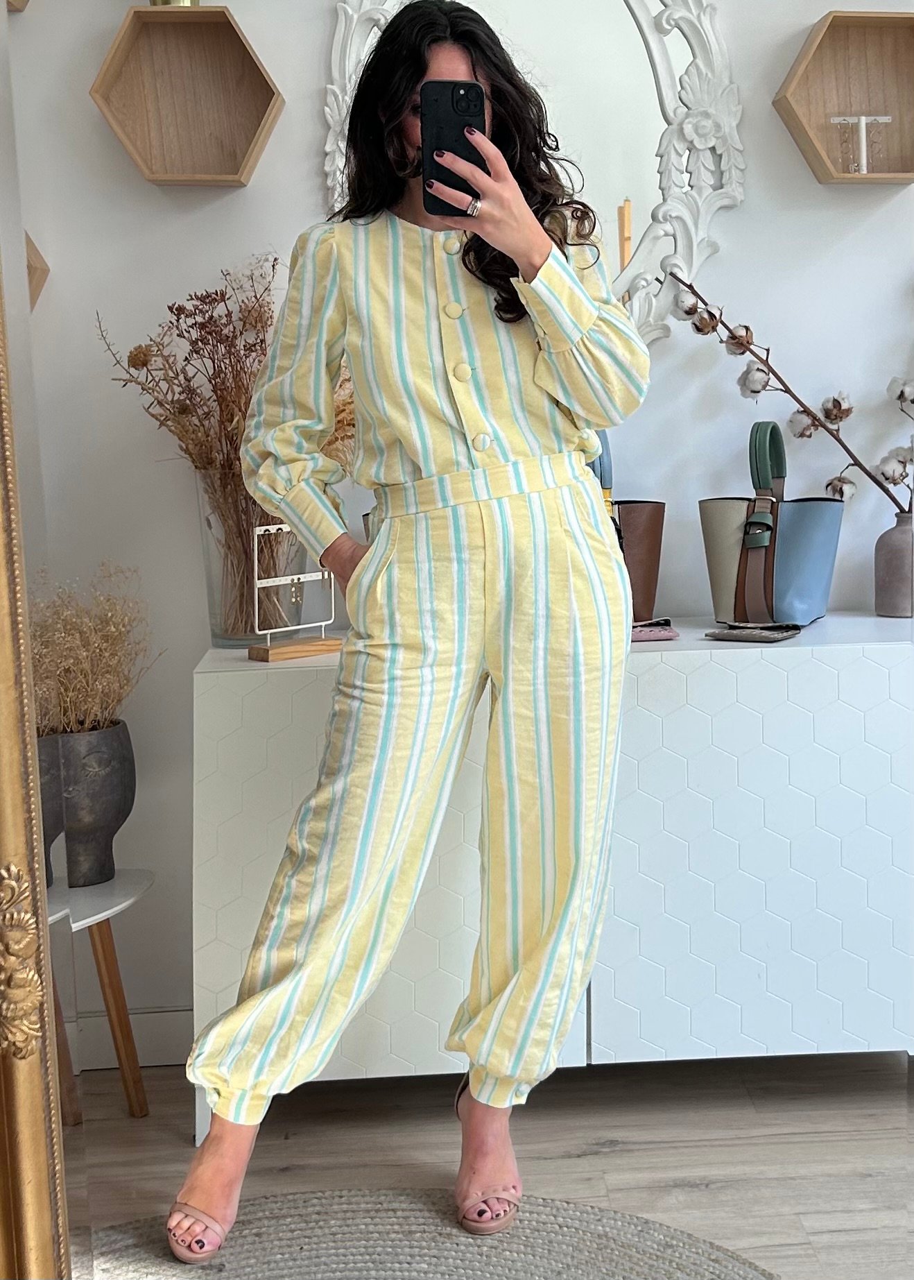 Pantalón en estampado de rayas, color amarillo y verde agua, bolsillos laterales, cintura engomada en la parte de atrás y bajo del pantalon con puño. Este modelo de pantalon tiene a juego una chaqueta.