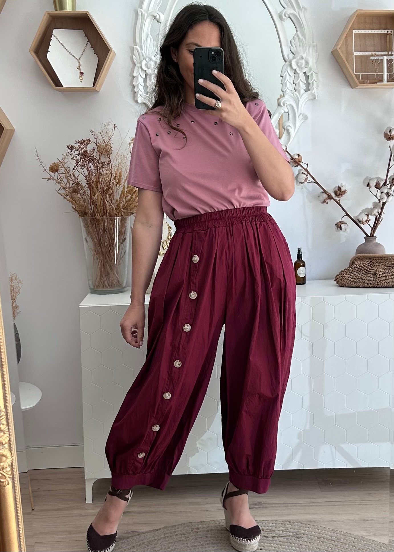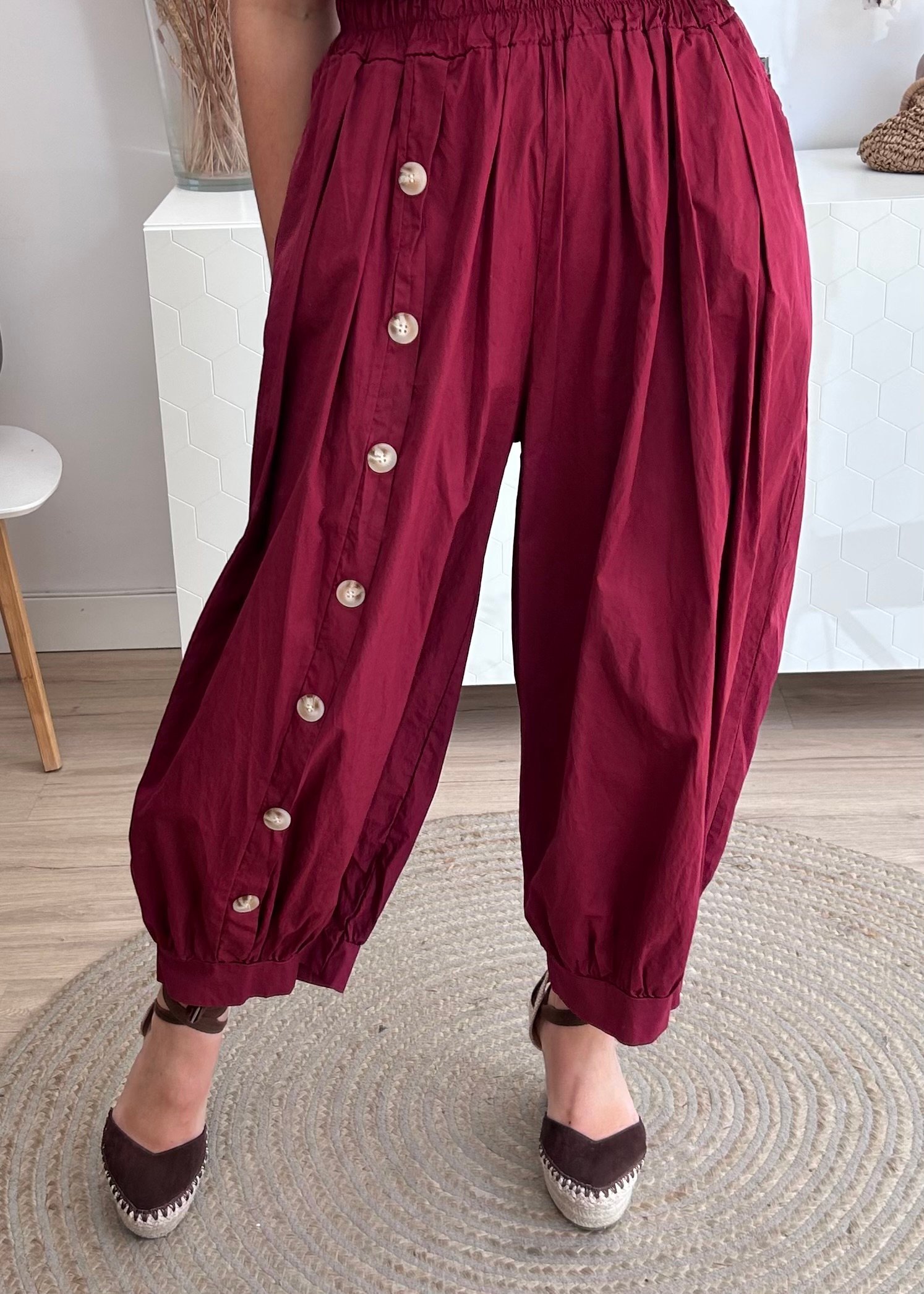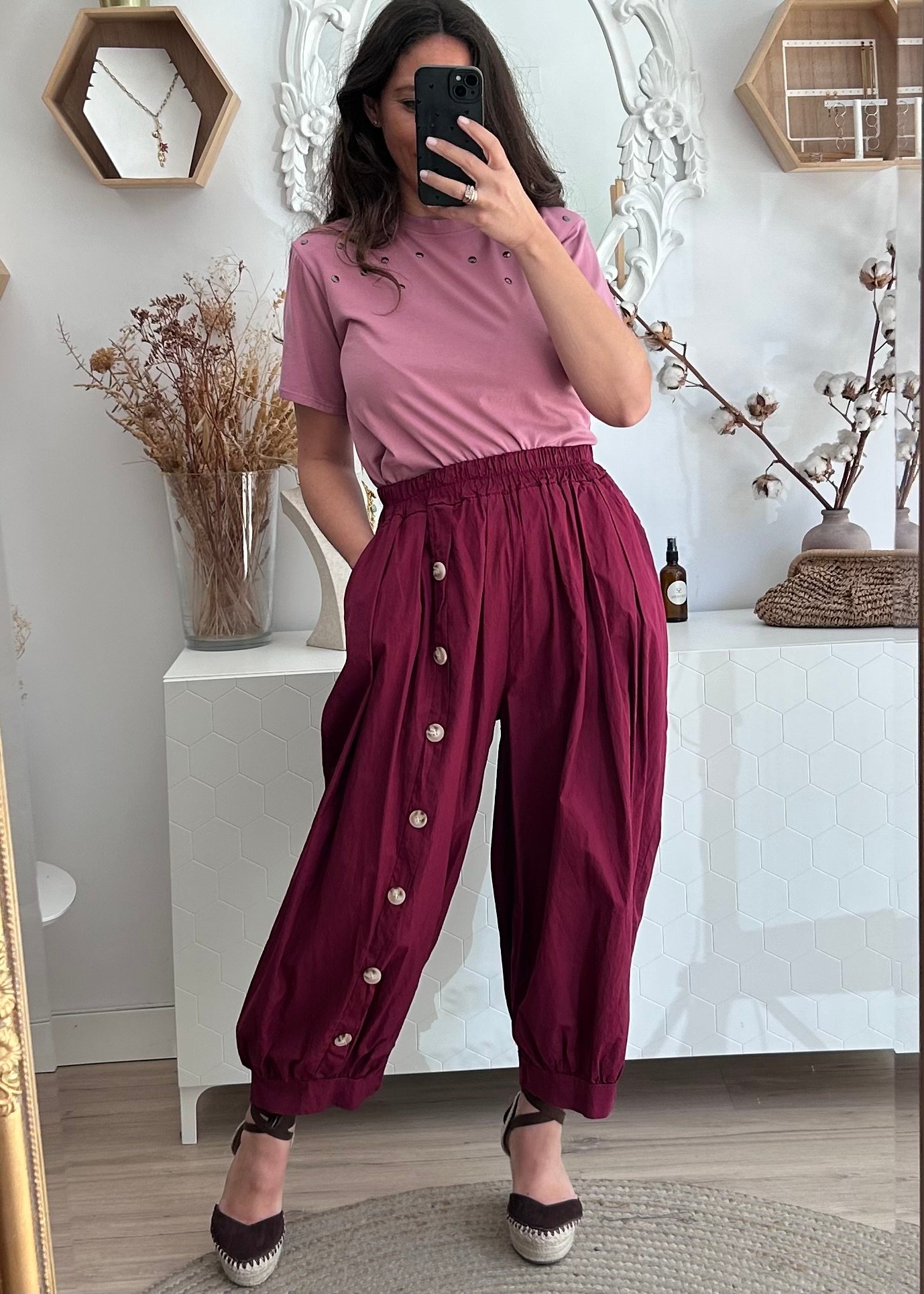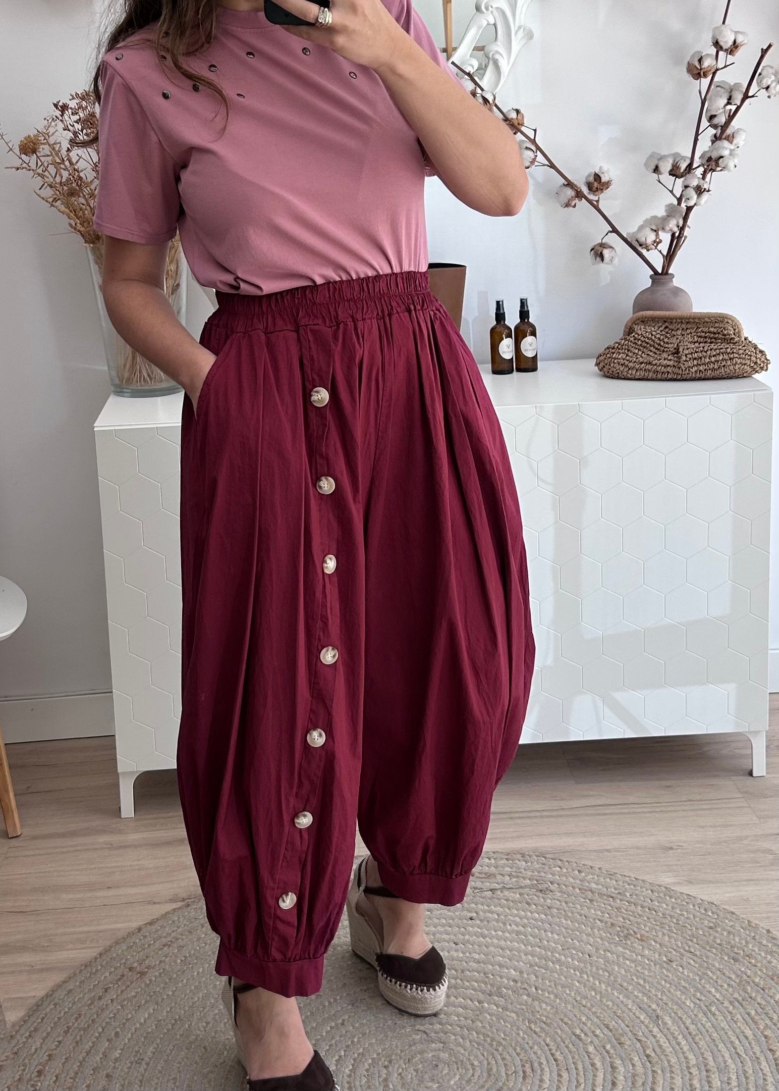 Pantalón en color burdeos, de corte globo y cintura engomada que hace que ajuste desde la talla XS a la XL.