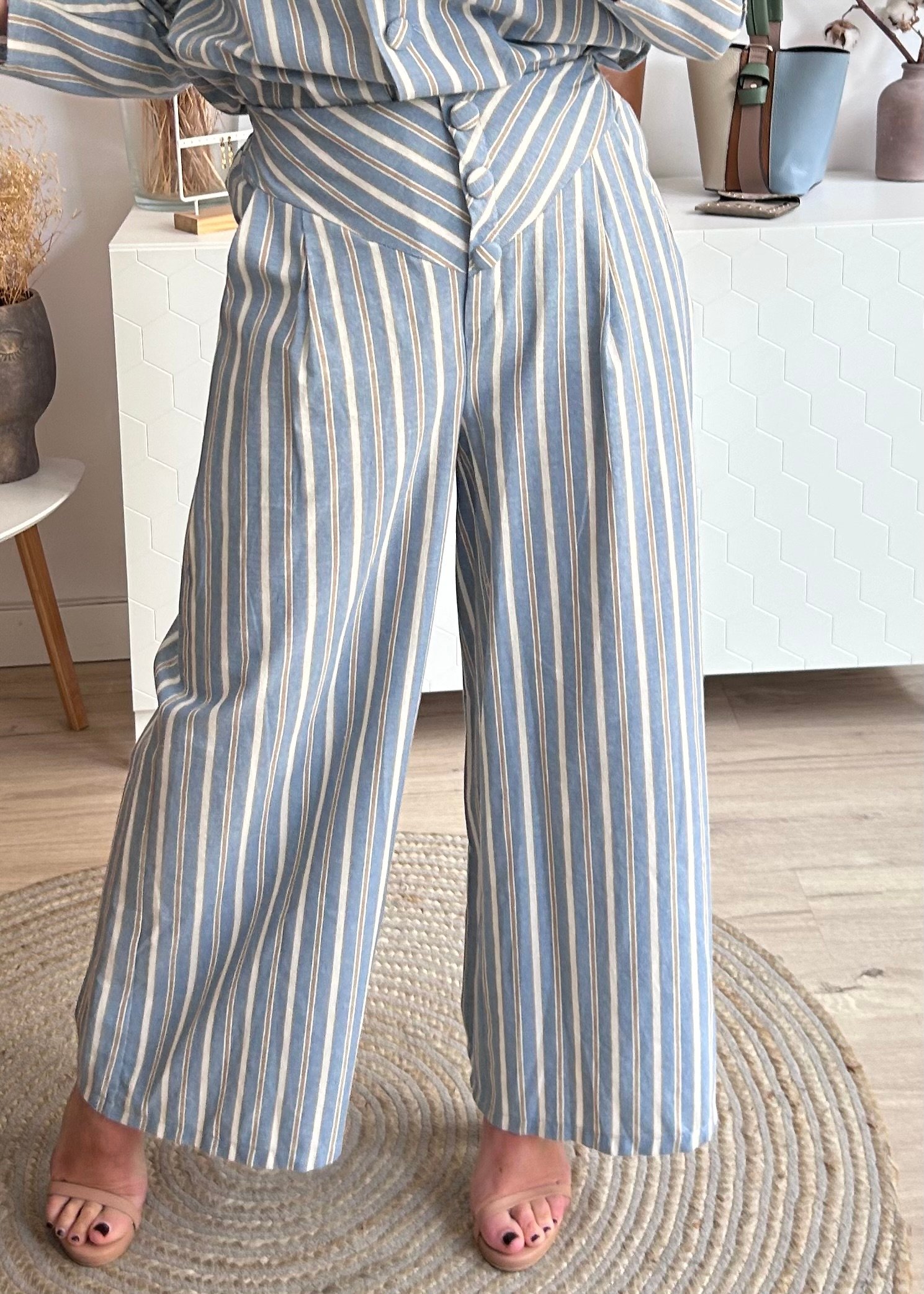 Pantalón con estampado de rayas, cintura engomada en la parte de atrás y detalle de botones en la parte delantera forrados en la misma tela.