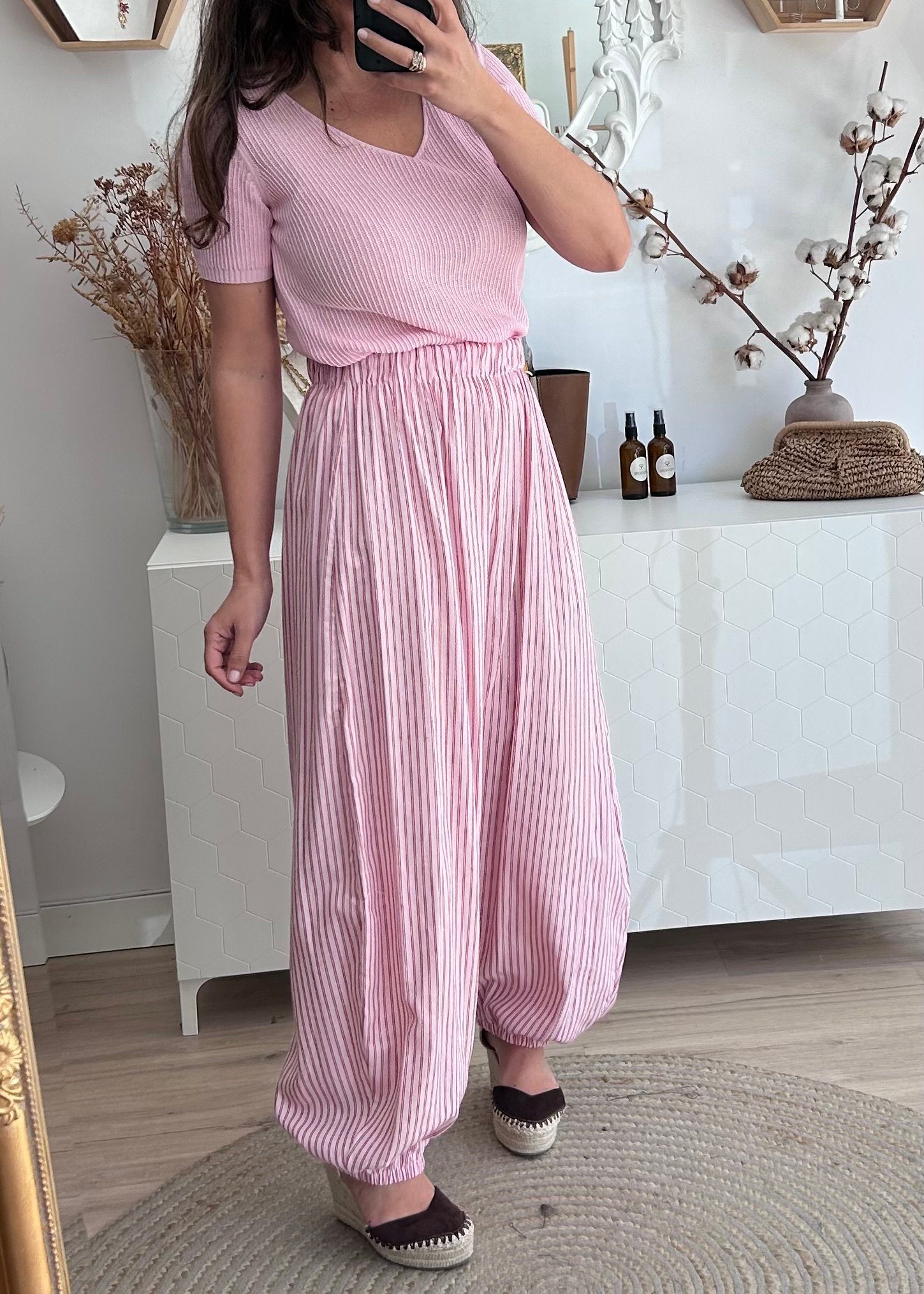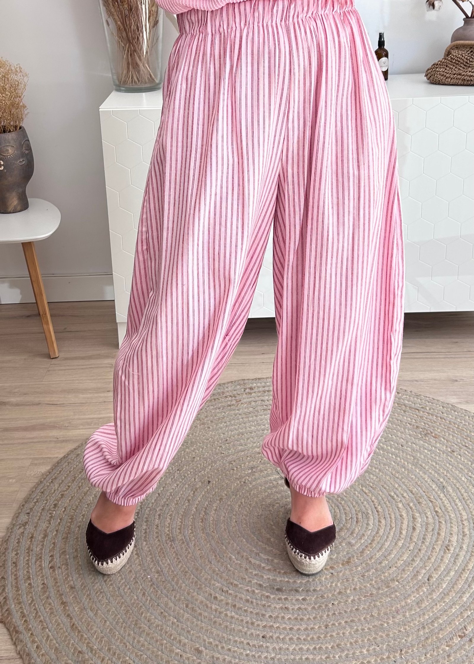 Pantalón en color rosa claro con rayas en burdeos.