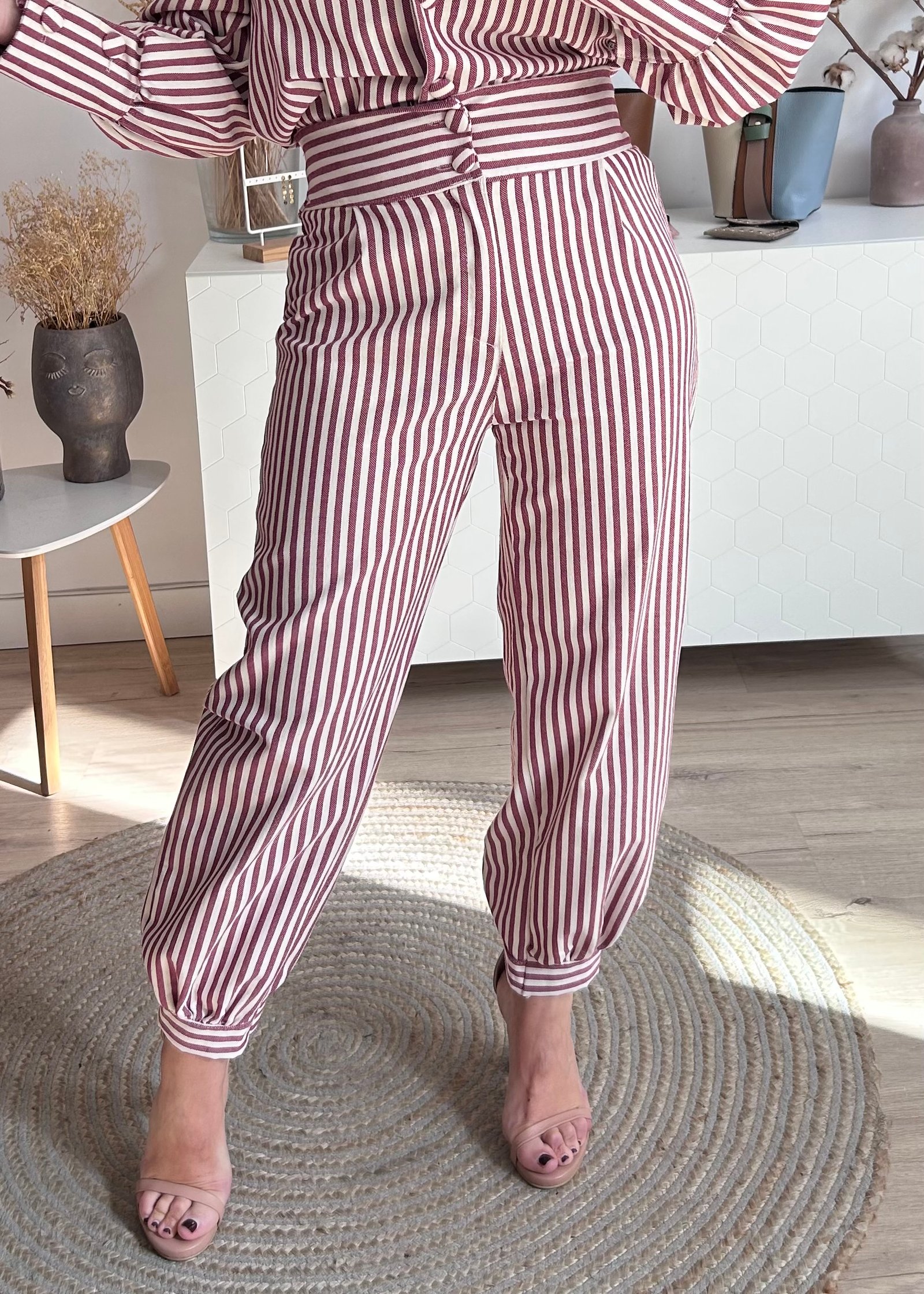 Pantalón de rayas en color burdeos, cintura engomada en la parte de atrás y cierre delantero con botones forrados en la misma tela. El bajo del pantalón lleva puño. Este modelo de pantalón tiene a juego una chaqueta.