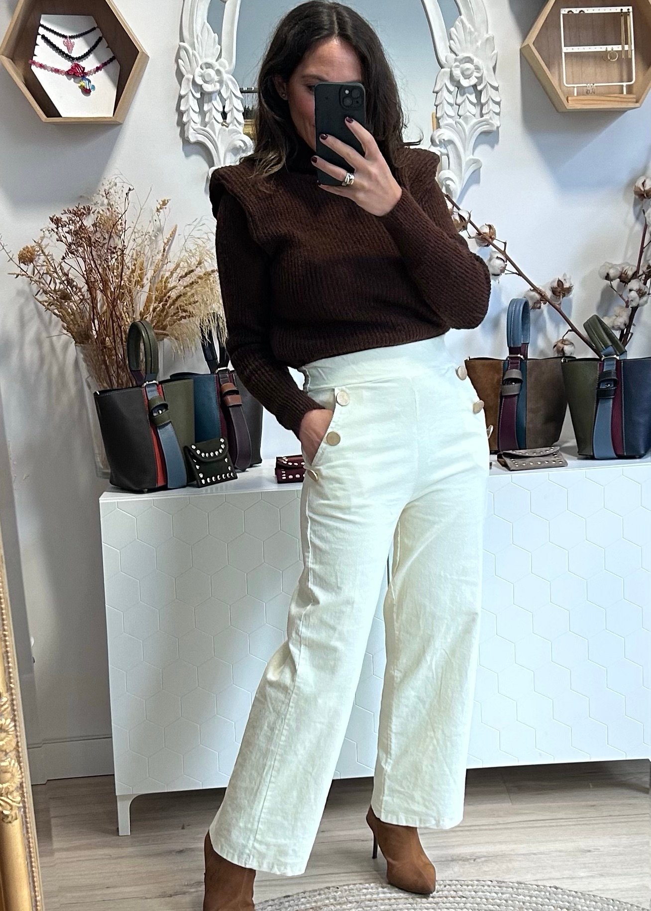 Detalle de botones dorados en los bolsillos