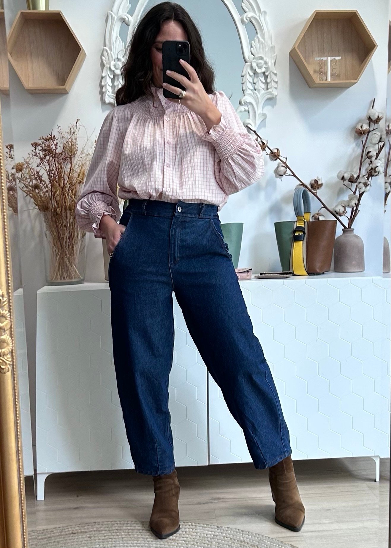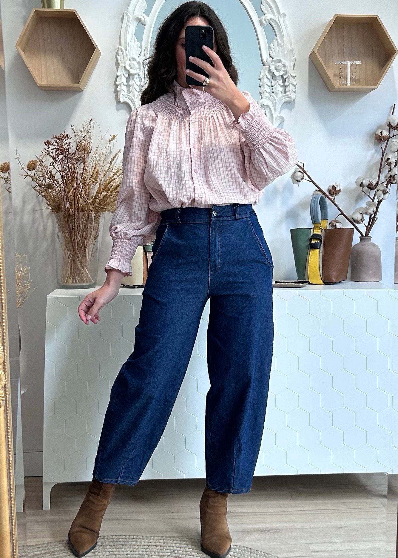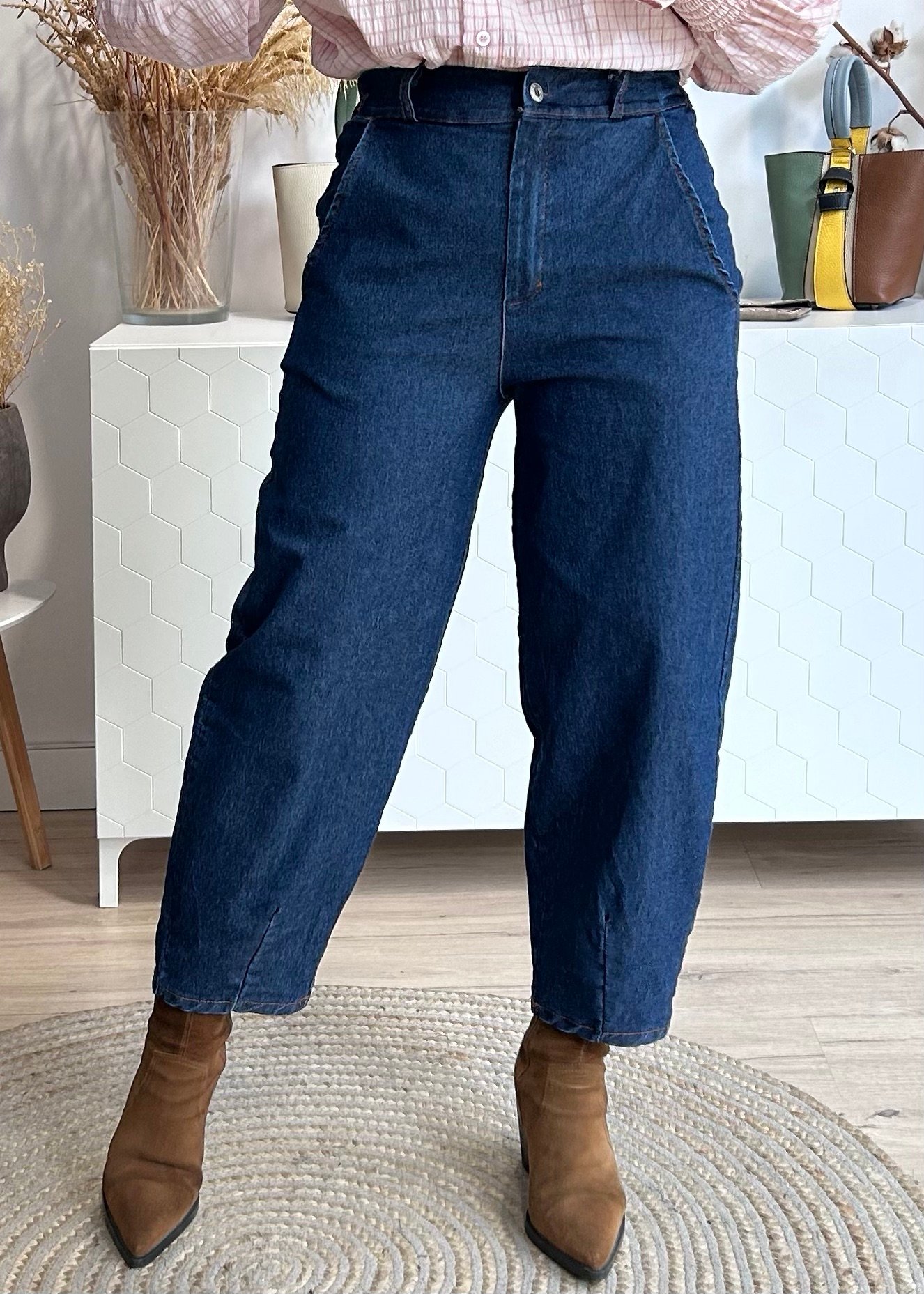 Pantalon vaquero en azul oscuro con cintura engomada en la parte de atrás. Tiro alto y forma globo.
