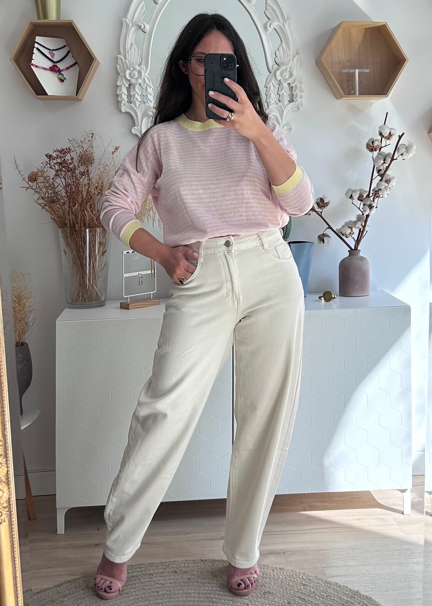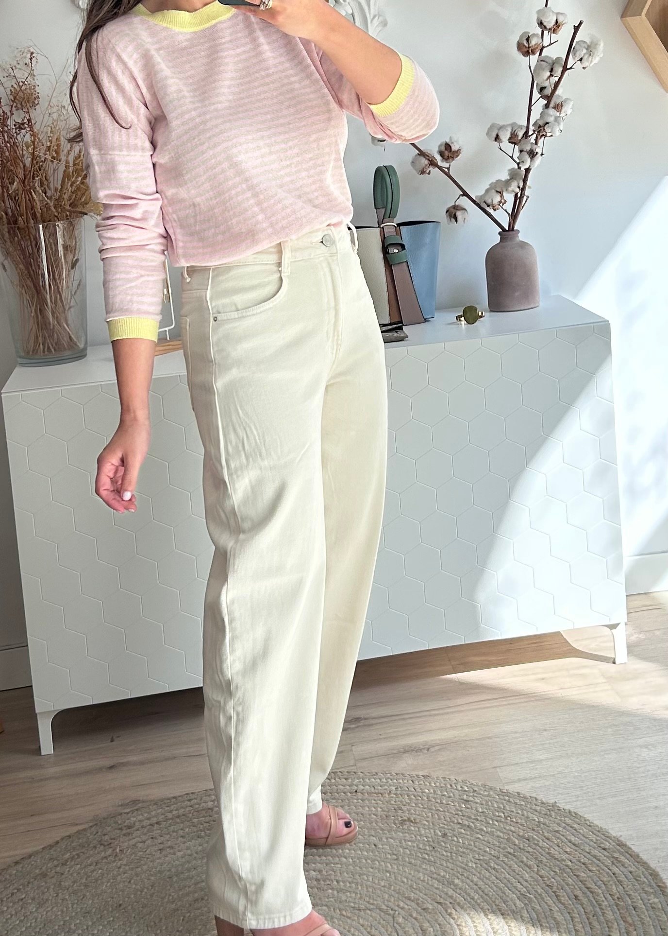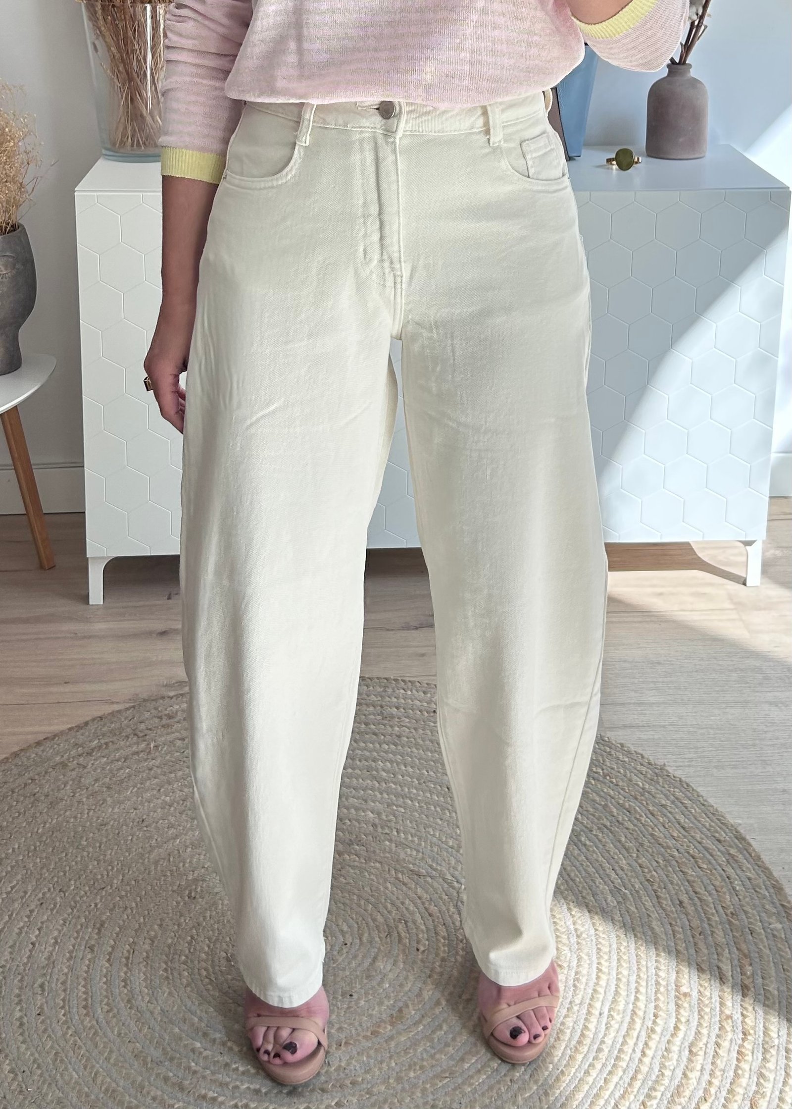 Pantalón vaquero tiro alto corte bolls en color beige.